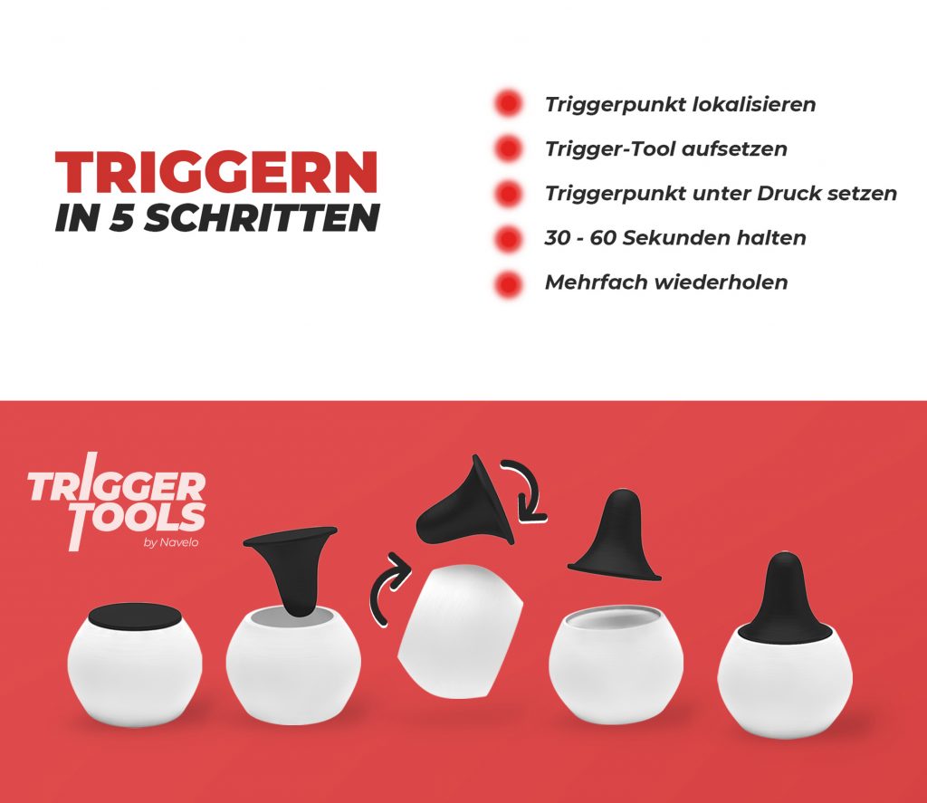 Für jeden Anwendungsbereich den passenden Trigger. Flach, spitz oder richtig groß, zur gezielten Behandlung spezieller Reflexzonen.